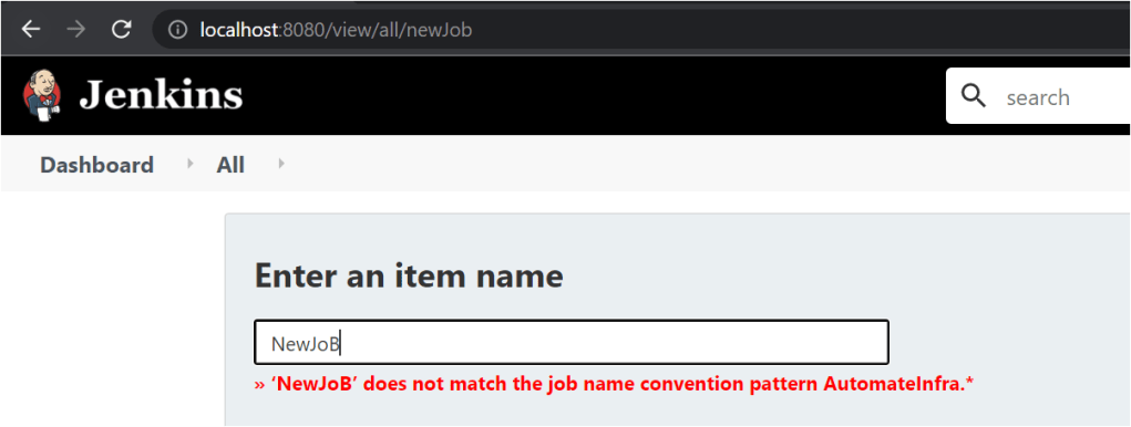 1. Next, try creating a a new Jenkins Job with random name then it will not allow you and display the error message.