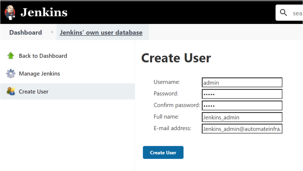 • Go to Manage Jenkins and Navigate to Manage users in the Jenkins UI.