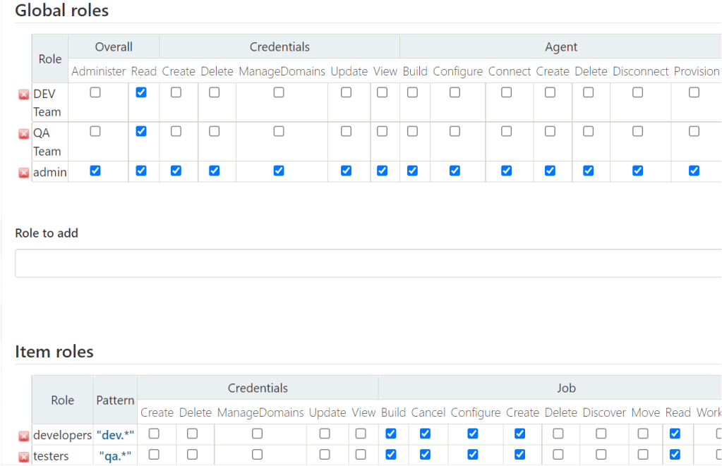 • Add 2 Items Roles developers and Testers with define patterns so that Jobs names are declared accordingly.