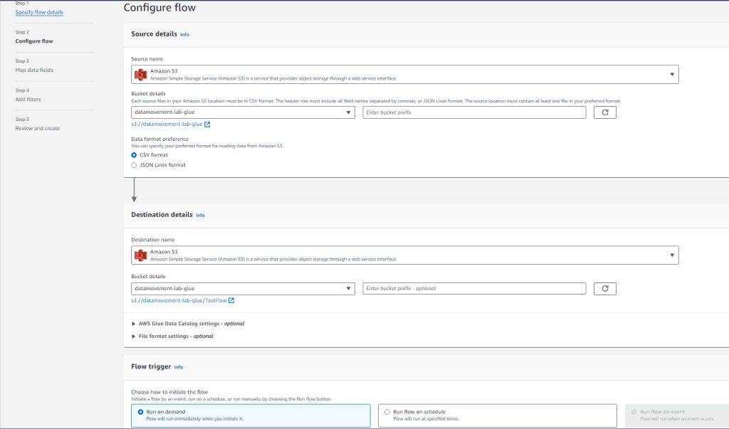 - Run on schedule — Amazon AppFlow runs the flow on a recurring schedule.