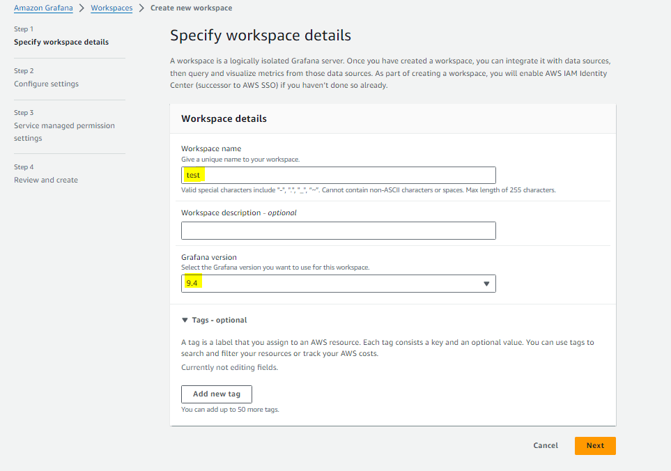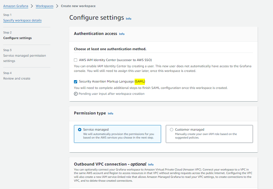- Open the Amazon Managed Grafana console Choose Create workspace-> Workspace name and Workspace version.