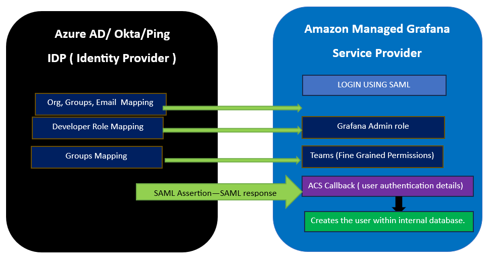 SAML uses IDP to offer single sign on for logging into Grafana console of your Amazon Managed Grafana workspaces.