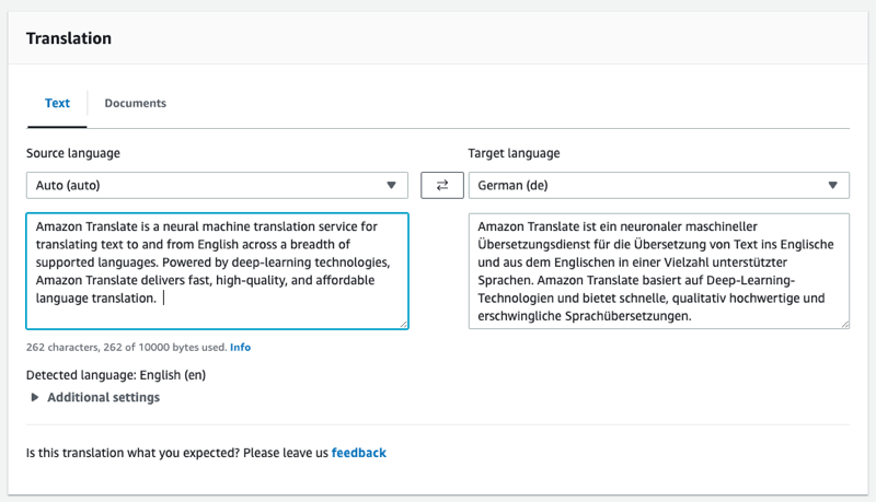 - The easiest way to get started with Amazon Translate is to use the console to translate some text. You can translate up to 10,000 bytes of text using the console.