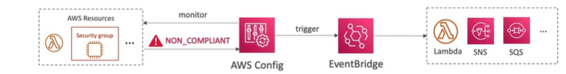 Well, we can use if EventBridge to trigger notifications, whenever our resources are not compliant. So, for example, we monitor our security group, it becomes not compliance. Then we can trigger an event in EventBridge, and then pass it on to whatever resource you wants. You could use an SNS filtering to have a filtered SNS topic, and then you can send it these notifications, for example, to an admin email or to a slack channel and so on to get all these notifications in one place.