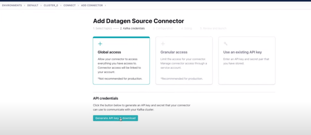 confluent api-key create --resource <cluster-id> # This will generate the API key and the secret.
