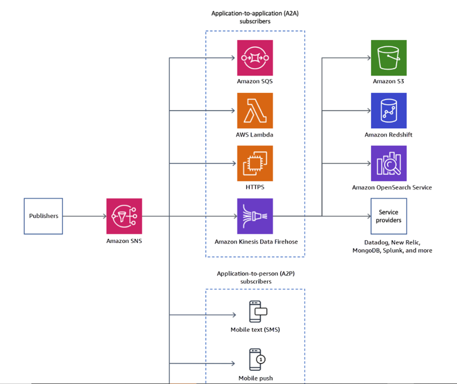 - SNS supports application-to-application messaging such as Amazon Kinesis Data Firehose delivery streams, Lambda functions, Amazon SQS queues, HTTP/S endpoints, and AWS Event Fork Pipelines can subscribe to SNS topics.