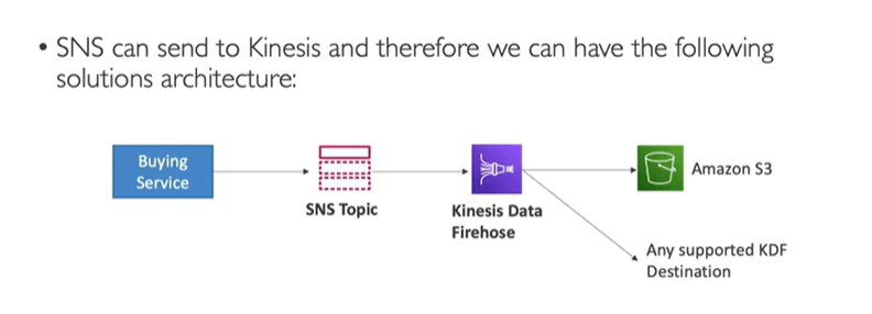 - Amazon Kinesis Data firehose: Deliver events to delivery streams for archiving and analysis purposes. Further you can deliver it to AWS destinations such as AWS S3, Amazon Redshift, Amazon OpenSearch