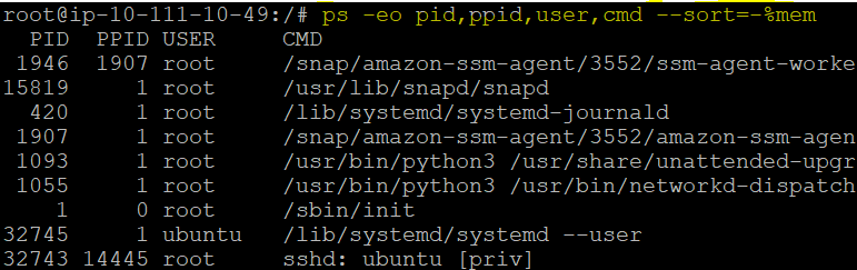 ps -eo pid,ppid,user,cmd --sort=-%mem