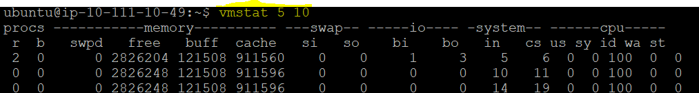 vmstat 5 10 # Here 5 denotes every 5 seconds and 10 denotes for 10 iterations